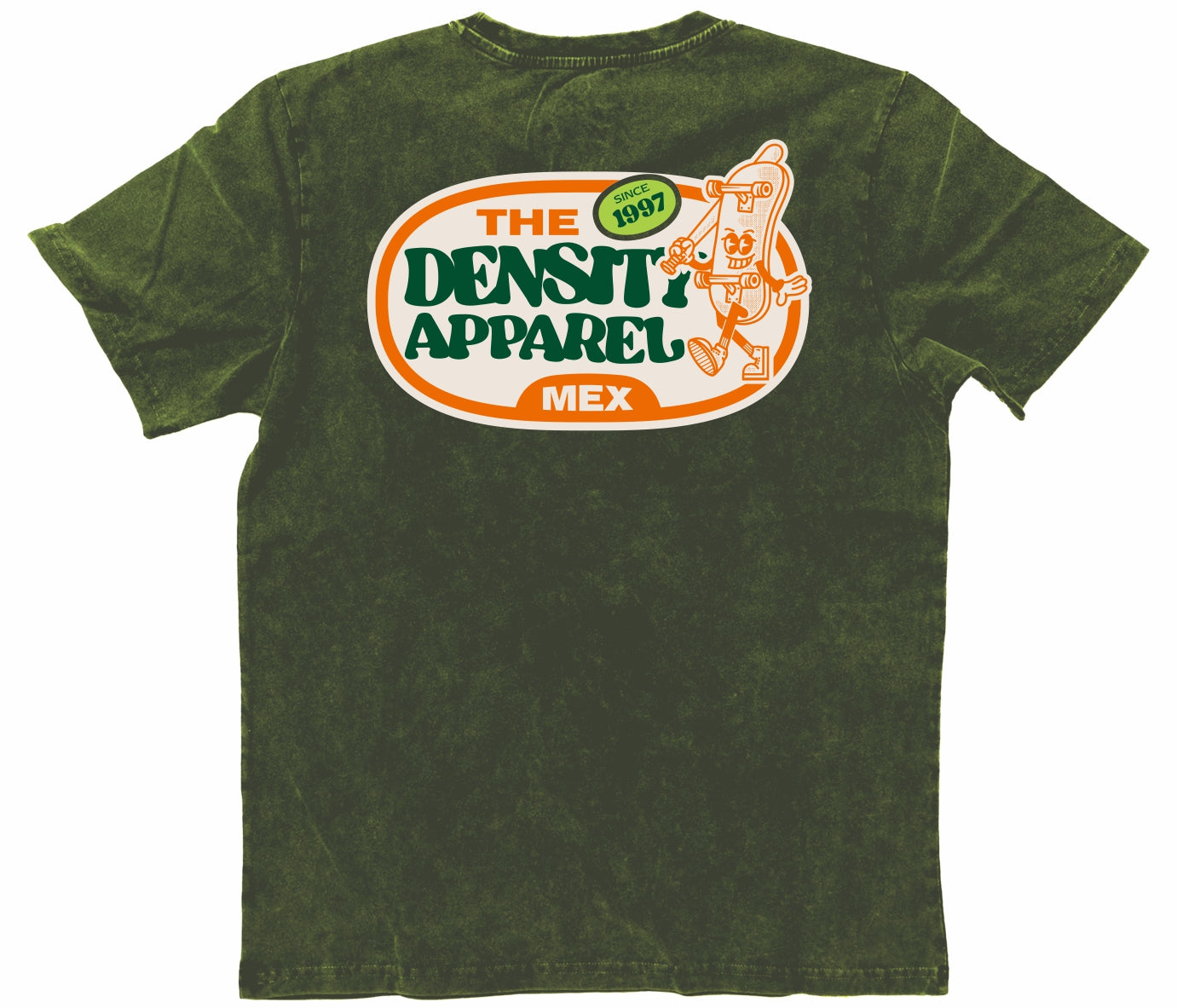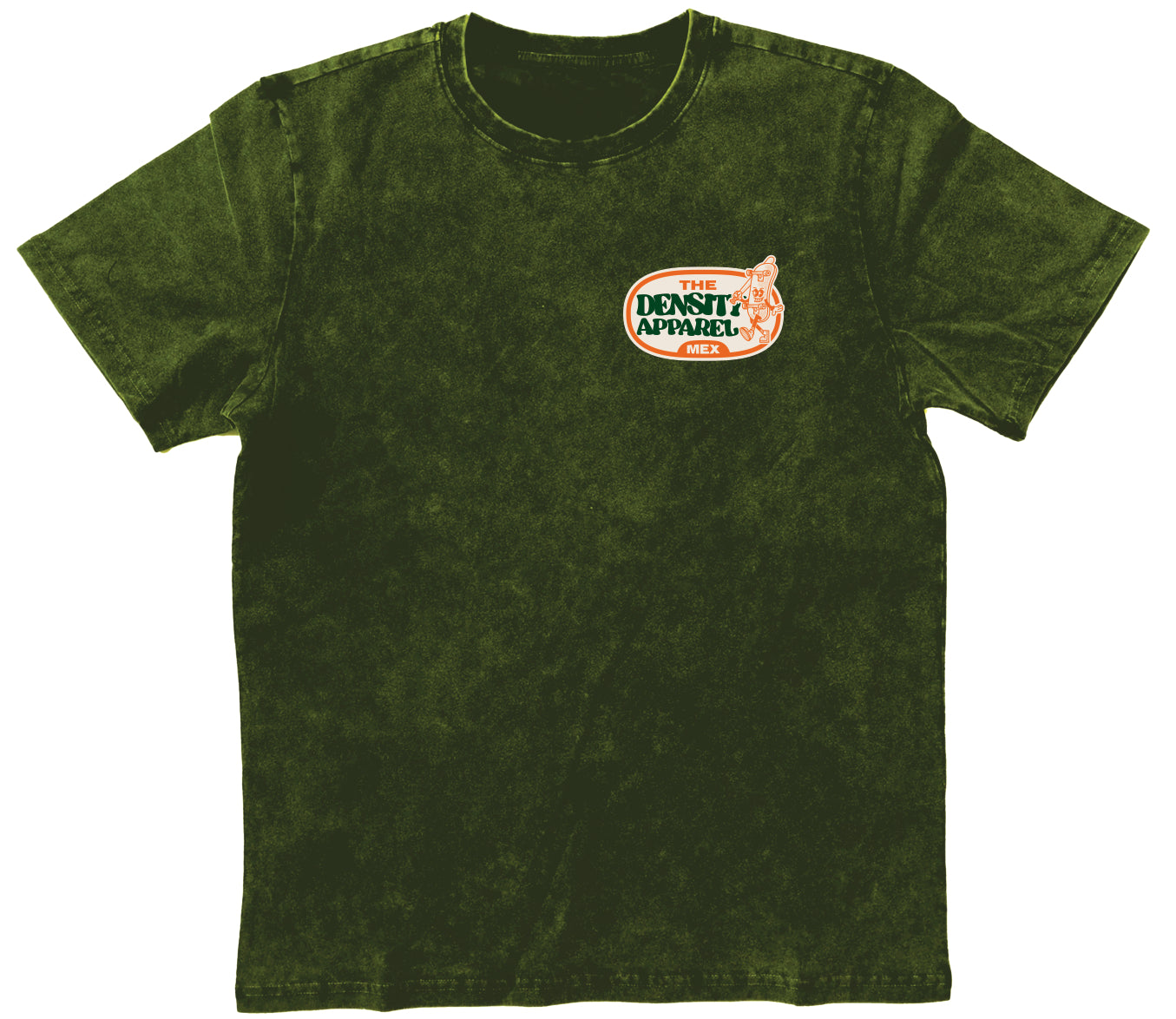Playera básica manga corta100% algodón, proceso destructo (stonewash), estampado serigrafia, color de la tela verde stone.