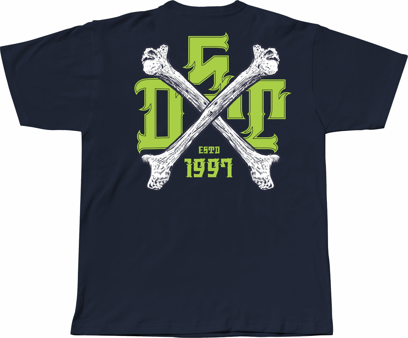 Playera oversize manga corta, 50% algodón 50% poliéster peinado, pesado de 260 gramos, estampado serigrafia y tinta puff (inflable), color de la tela azul marino.